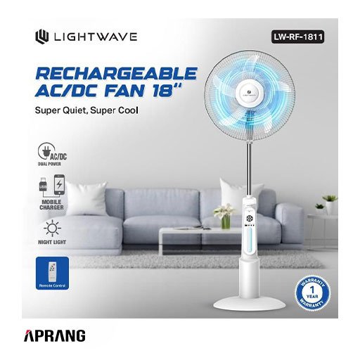 Le ventilateur rechargeable Lightwave LW-RF-1811 est idéal pour ceux qui recherchent une solution de refroidissement fiable, durable et écoénergétique. Grâce à son puissant flux d’air, ses multiples options de charge et ses fonctionnalités intelligentes, il offre un équilibre parfait entre performance et praticité, quelle que soit la situation.